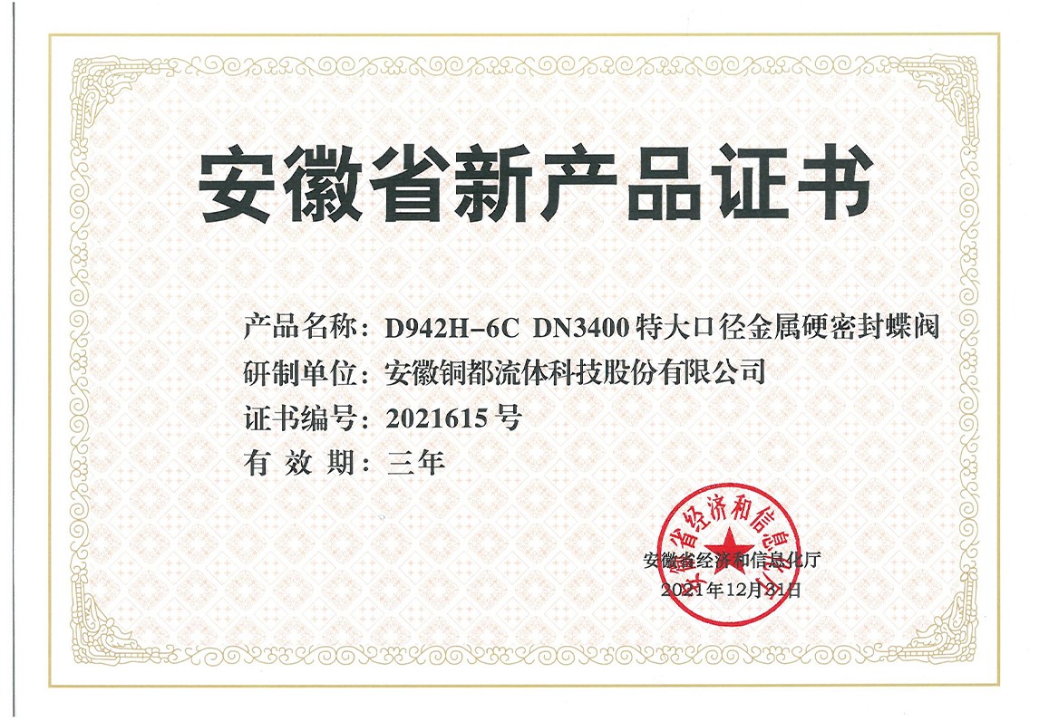 安徽省新產(chǎn)品證書-硬密封蝶閥