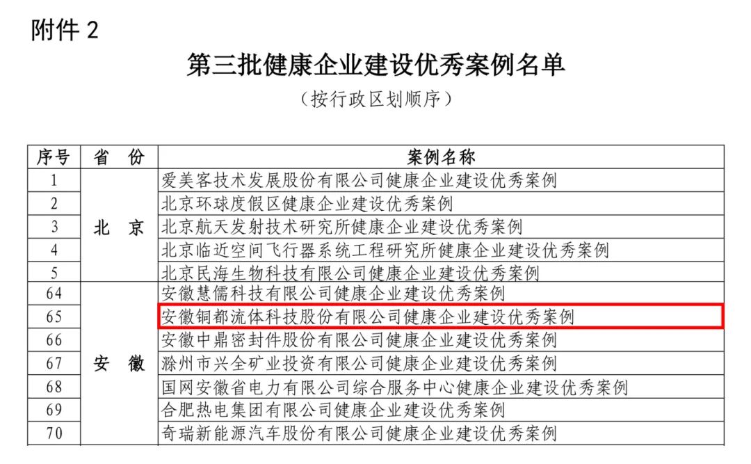 2024年5月6日國(guó)家衛(wèi)生健康委辦公廳公布第三批健康企業(yè)建設(shè)優(yōu)秀案例名單,銅都流體成功入選國(guó)家衛(wèi)健委第三批健康企業(yè)建設(shè)優(yōu)秀案例名單,成為安徽省6家入選優(yōu)秀案例之一。
