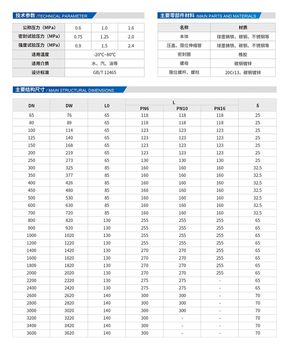 松套限位補(bǔ)償接頭安裝在管道上后,擰緊螺母,起到密封和連接作用。當(dāng)溫度變化時(shí),管子能在接頭中間自由地伸縮,當(dāng)?shù)鼗鲁?、偏斜,它均能確保密封無(wú)滲漏,從而達(dá)到自動(dòng)補(bǔ)償之目的。